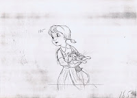 Penny's dialogue is: "Gee, we better hurry, or we'll be late for supper." Ollie synced his animation beautifully with the two accents HURRY and SUPPER. Penny lifts up the cat on HURRY, and then she makes her first step forward on SUPPER.