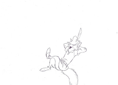 The animation reads beautifully because the action is broken up very clearly. Robin raises his arms and slides down the side of an oak tree to land in a sitting position, hands behind his head. To show his confidence as well as comfort level, he crosses his legs at the end of the scene. During this leg motion the rest of body is kept pretty still, so it doesn't interfere with the principal action.