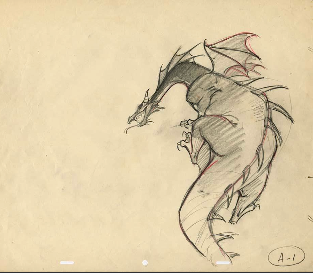 Maleficent as a dragon climbs up a rock to fight Prince Phillip. Great drawing, possibly by animator Eric Cleworth.