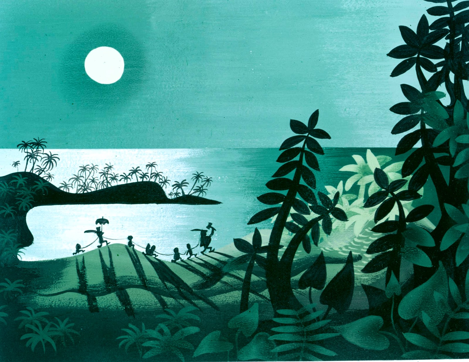 Much has been written about Mary Blair and her work on Disney films as well as Disneyland attractions. There is a sophisticated simplicity going through her work that Walt Disney was attracted to, and so are we. This lady was a trendsetter, who helped define modern art and color in animation during the post war era and beyond. Here are a few candid photographs toward the end of her career at Disney, followed by Peter Pan development art.