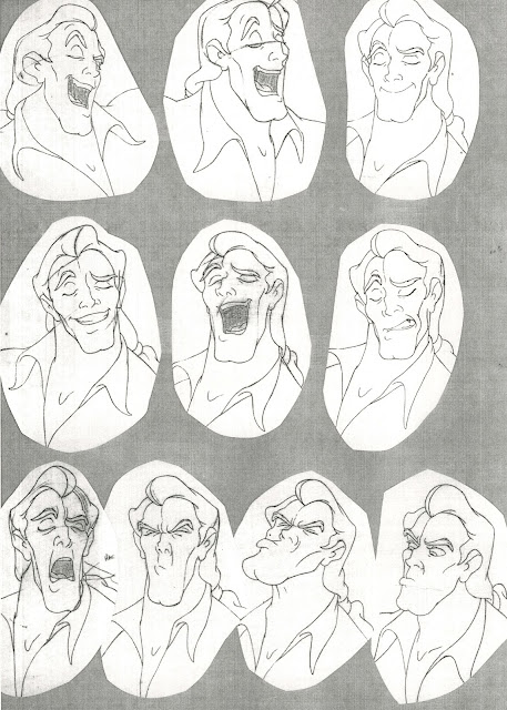 How big of a jaw? That was the question I wrestled with during the character design phase for Gaston. I had preferred a more caricatured, villain looking version with a big jaw. When I was asked to go into a different direction and "beautify" Gaston, I drew the following portraits in protest, almost angry. I was thinking: Is this what you want? You can't be serious. TV soap opera looks for a Disney villain?