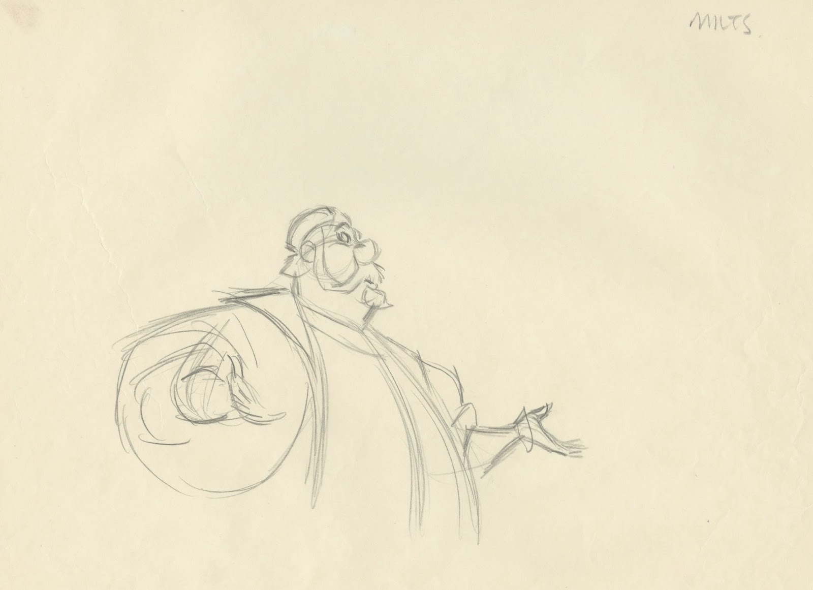 The rough sketch above is from one of my favorite Milt Kahl scenes. This is Seq. 13, Sc. 53.4, and the Disney draft says: