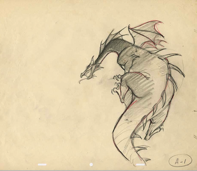 Maleficent as a dragon climbs up a rock to fight Prince Phillip. Great drawing, possibly by animator Eric Cleworth.