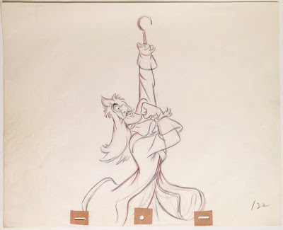 A selection of rough animation drawings from Disney's classic film Peter Pan. These Milt Kahl poses explain once again why Walt Disney needed to have Milt do the title character. The solid draughtsmanship alone with great attention to animatable anatomy made this animator casting obvious. Since there were several animators handling Pan, the original pencil tests revealed him in all kinds of different looks, from cartoony to too muscular. After Milt hit the roof, he then re-drew some of those key drawings so that clean up would have an easier time keeping the character on model.