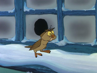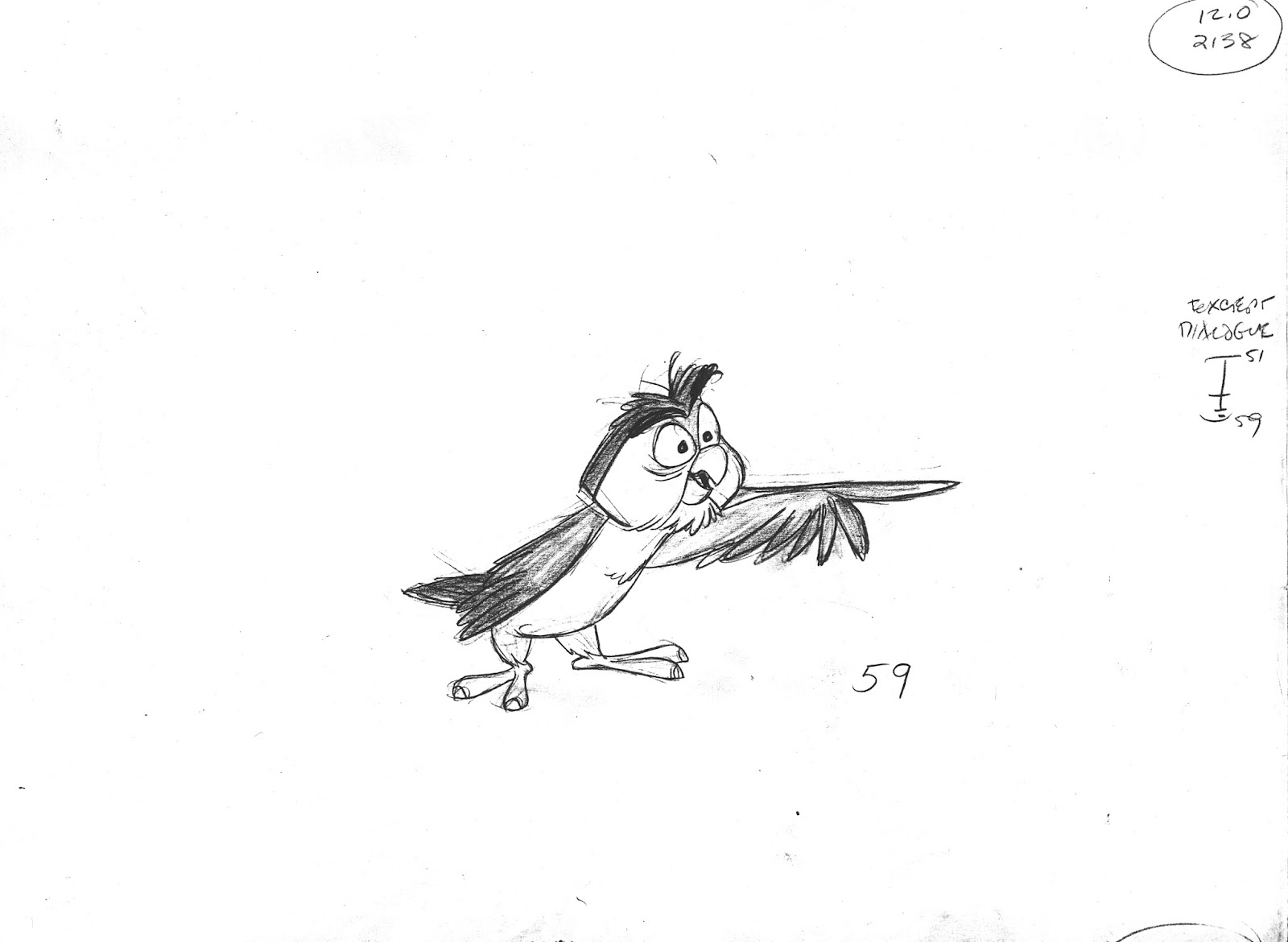 This scene with the owl Archimedes from The Sword in the Stone exemplifies Milt Kahl's modern approach to animation. Starting with Sleeping Beauty his drawings show a 2-dimensional graphic quality that becomes 3-dimensional when viewed in motion. It's a juxtaposition. It says: