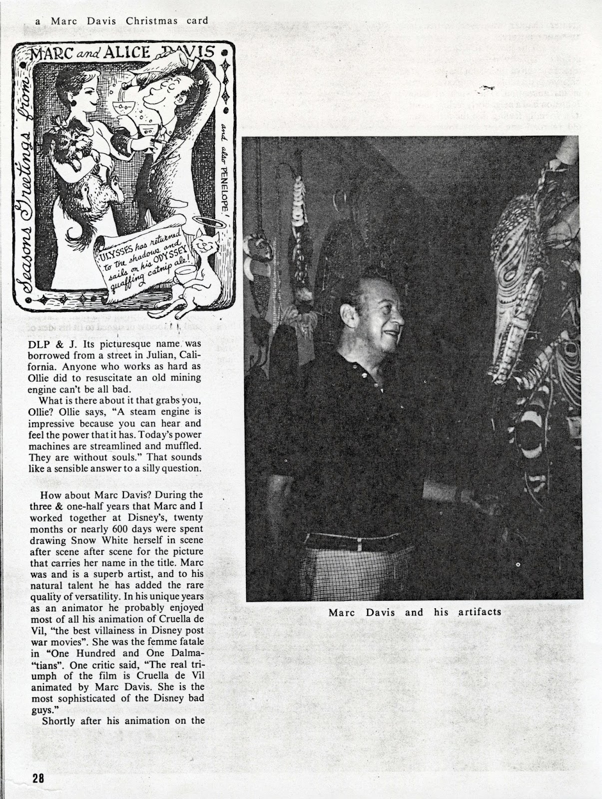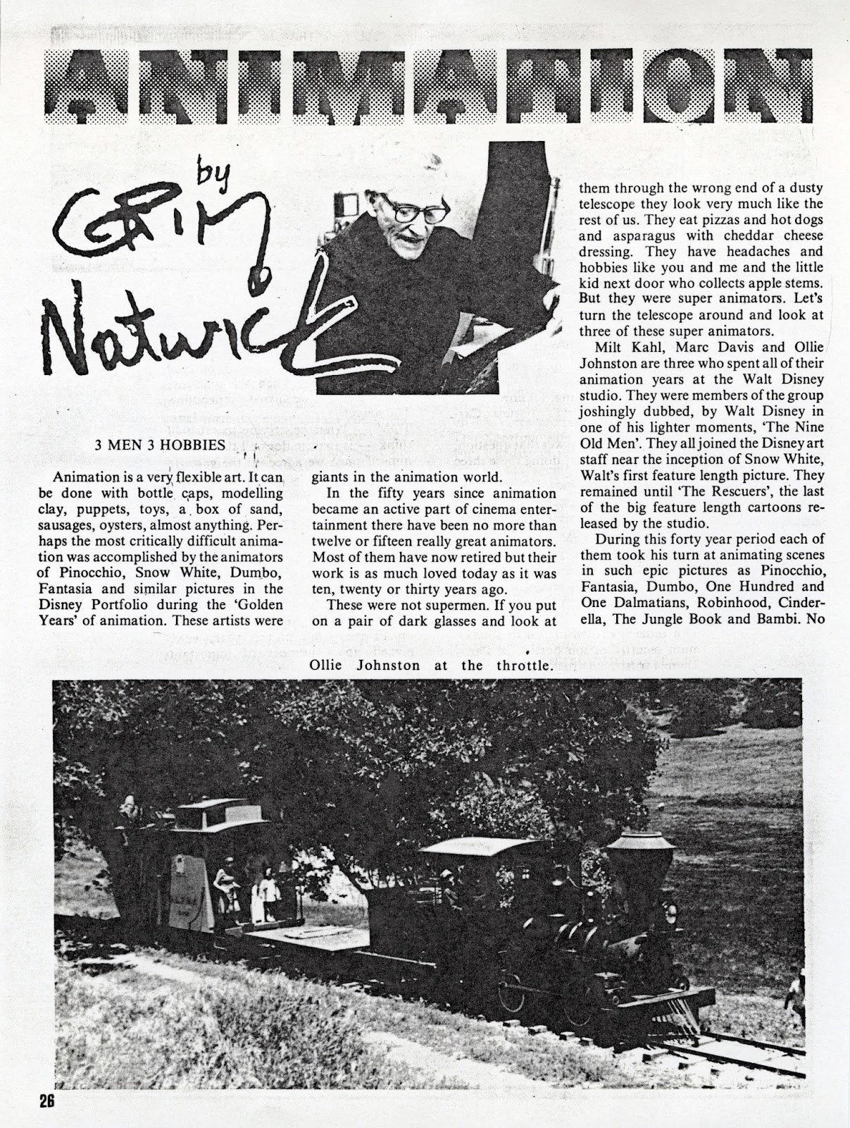 In this edition Grim talks about Disney animators Ollie Johnston, Marc Davis (who assisted Grim on the character of Snow White) and Milt Kahl. He discusses some of their work as well as their individual hobbies.