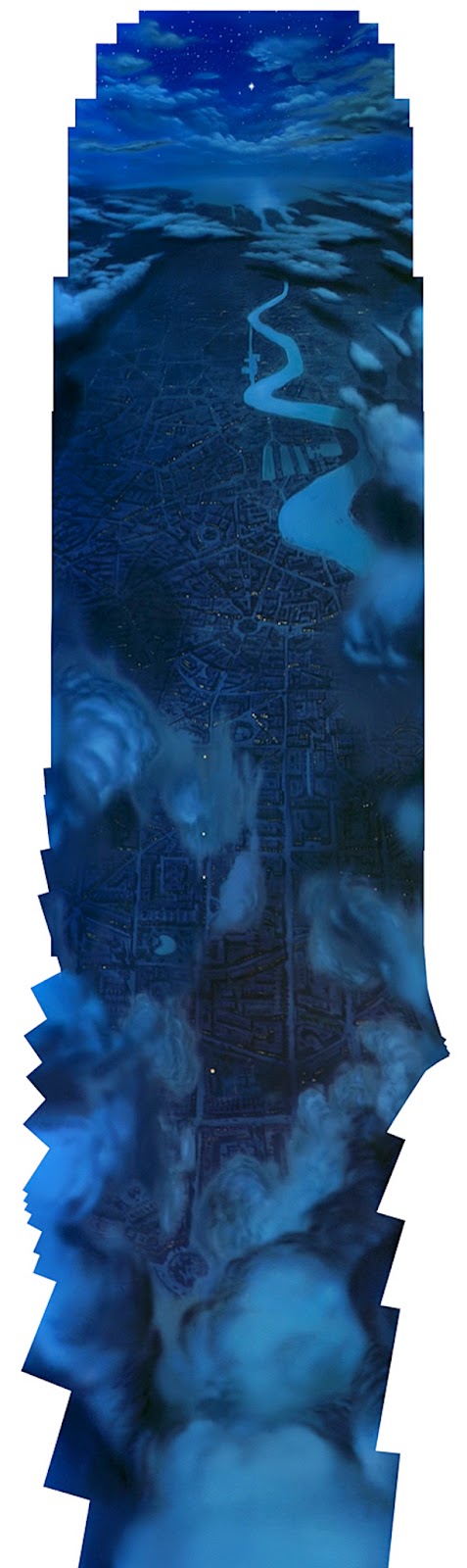 Kathryn Beaumont visits John Hench in this publicity still. Hench was a color stylist on the movie Peter Pan. Here he is looking at a layout for the the scene below, a gigantic camera move during the flight to Neverland sequence.