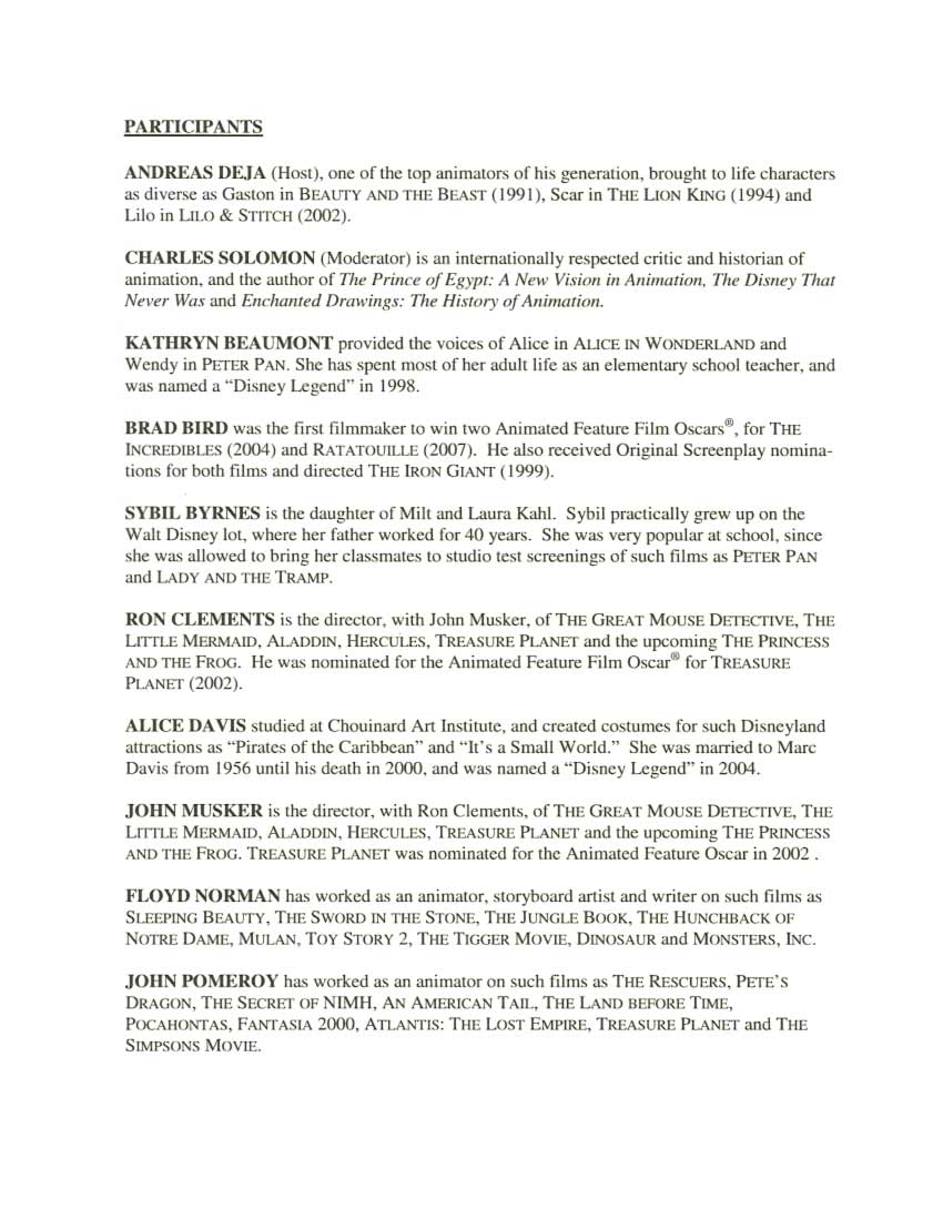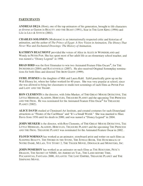 Next to me is Alice Davis, then Kathryn Beaumont, Brad Bird, John Musker, Charles, Floyd Norman, John Pomeroy and Ron Clements.