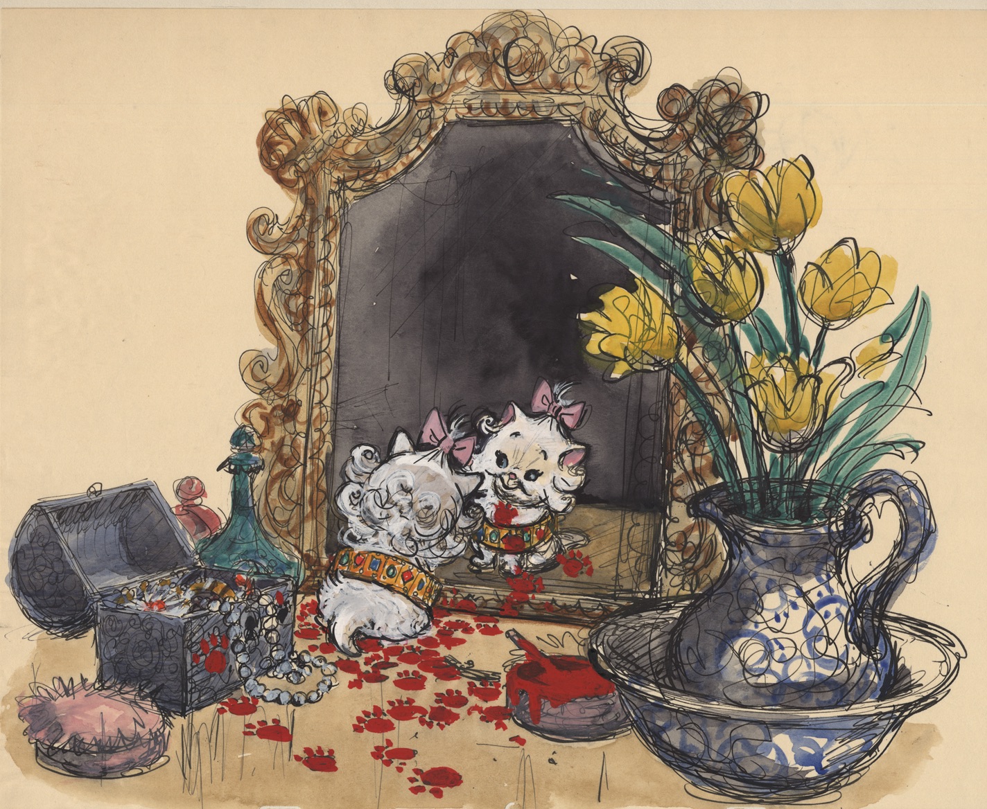 Pauper Mickey is walking through the Prince's palace, when he discovers his mirror image on the shiny floor. The storyboard suggested that he is delighted and does something fun to acknowledge the smooth floor.