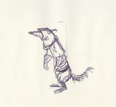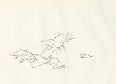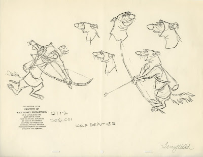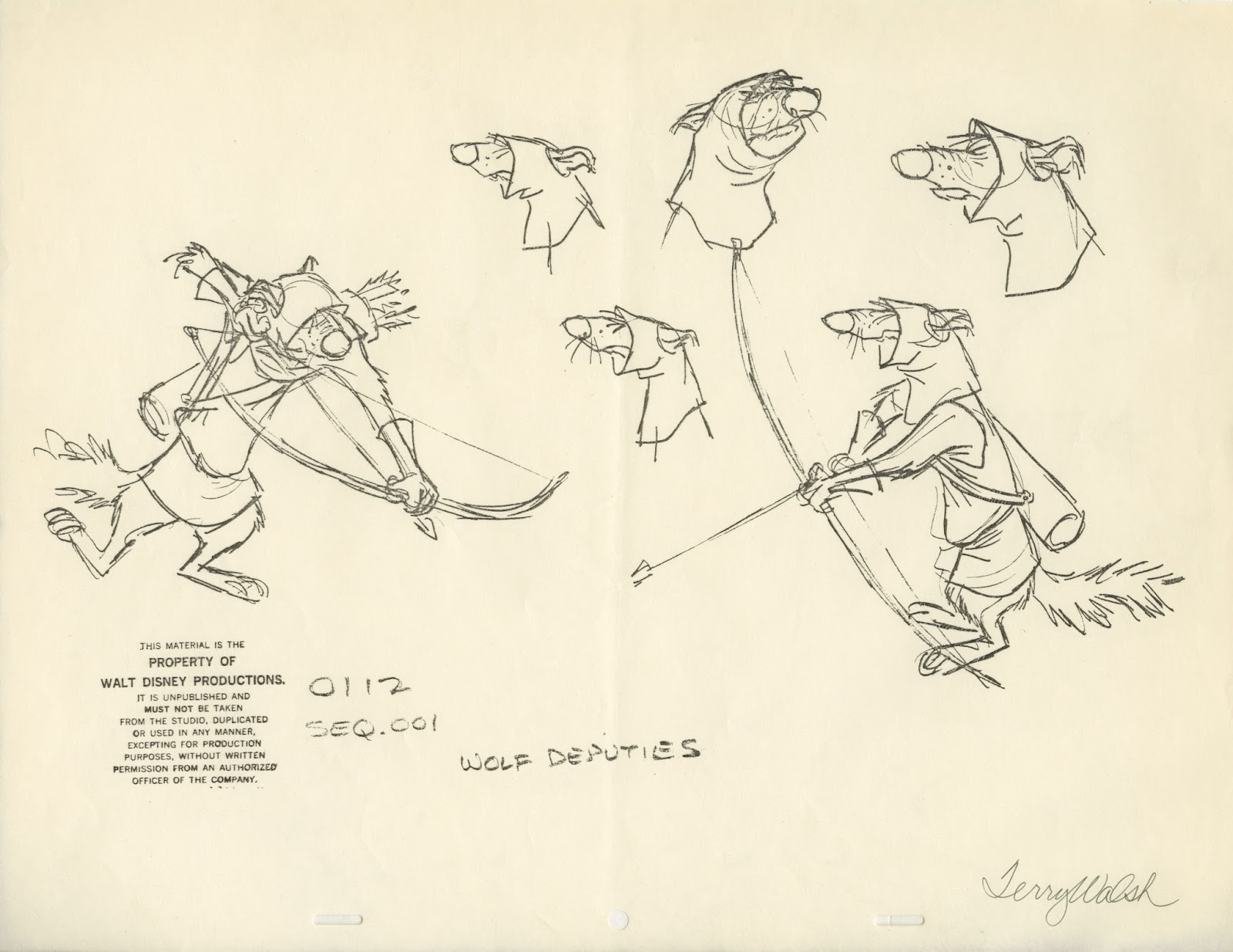 A while ago I posted a few sheets with rough drawings by John Lounsbery showing his early design approach for the henchmen wolves from Robin Hood.