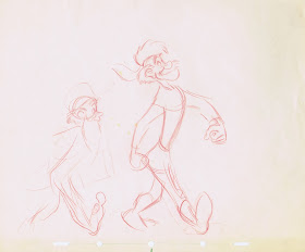 A beautiful unfinished staging sketch by Milt. Old Johnny is following his Angel into a pink apple blossom sunset at the end of the film.